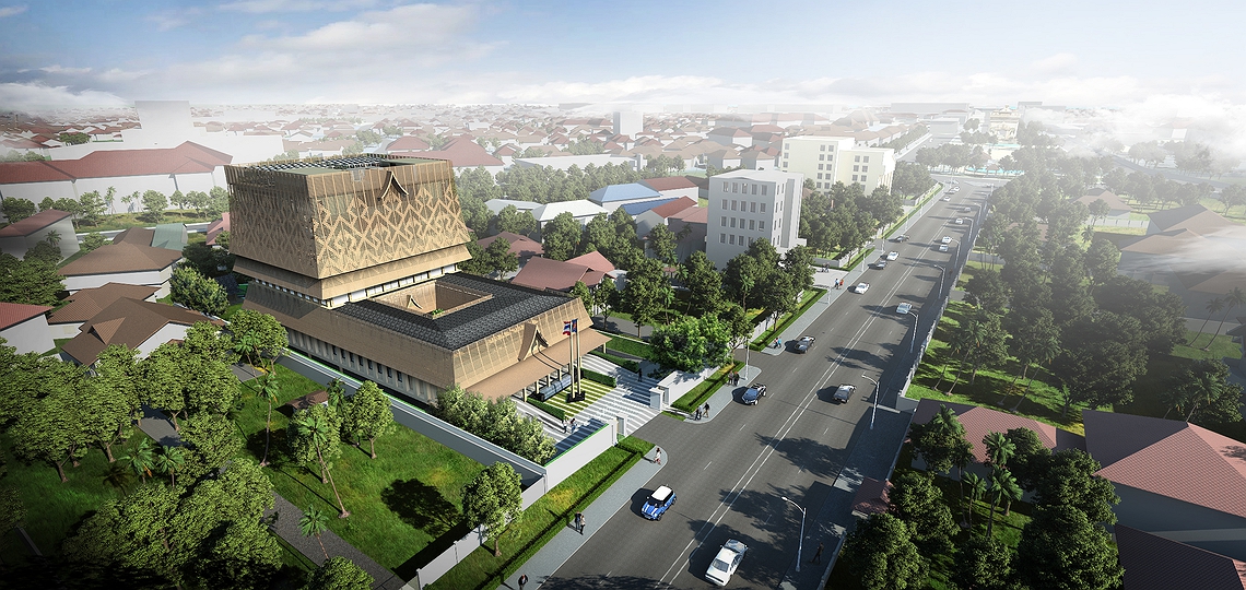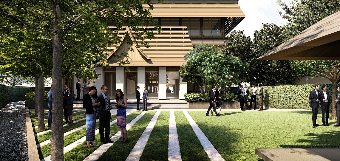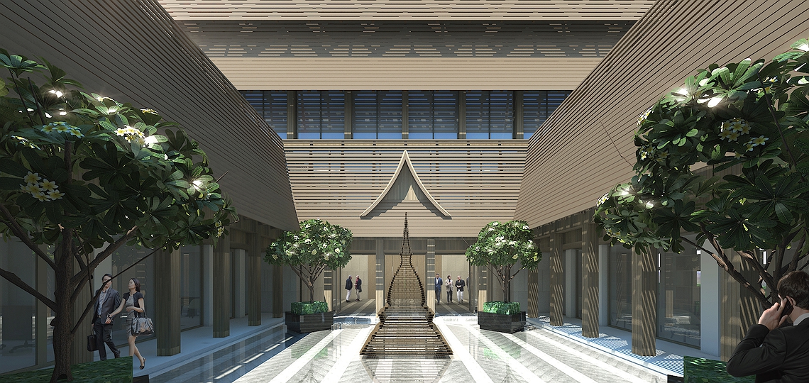 The humble gateway is the concept we chose to develop the building character. As the concept, the mutual belief and architectural elements are our key ideas. First key idea is about planning system, Phra Sumen Mountain is a reference idea to most of the Southeast Asian architectures, and it can be extracted into the layer of outer wall, layer of open space and layer of main element in the center. Second key idea is about architectural elements and sequence of space, Lan Chang style is a mutual architectural style between Thai and Lao. It can be described as a big eaves roof building, low ceiling height on the edge and high ceiling height in the center. Last key idea is about the Naga belief, a member of a class of mythical semi divine beings in Mekong River, Thai and Lao people extracted Naga into pattern and applied it to fabric pattern and other daily life materials. In this project, we applied the Naga pattern on the façade which could also act as a sunshade fin.
