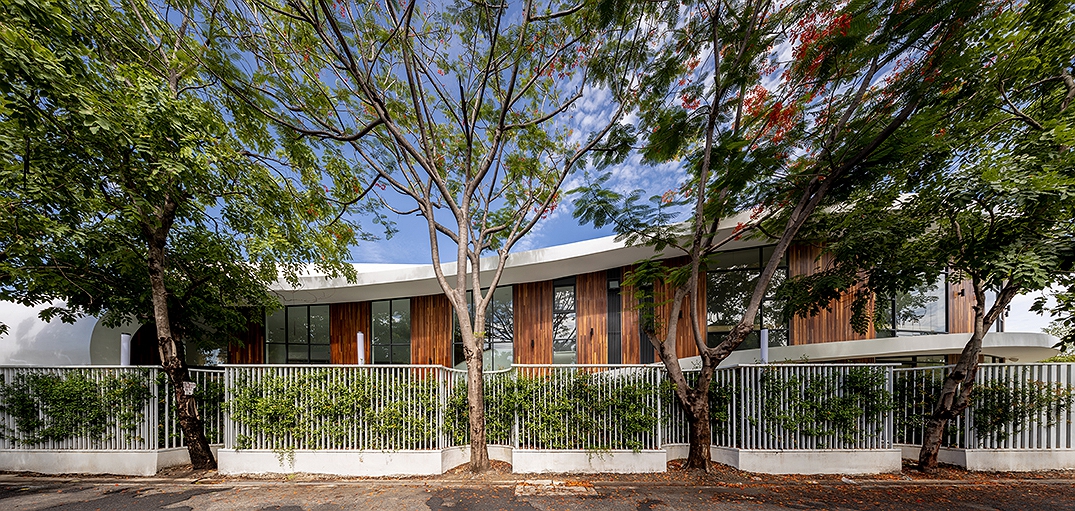 Inside the building the various kind of space is created to suit each individual function. The semi-outdoor space under the gym is set to be the swimming pools where the smooth linking surface from wall to ceiling with the greenery view at the end creates the cave-like space make the adventurous feeling for kids. The column free huge space is design for the gym suit for flexible function make the free-style playing space for kids. Classroom at the narrow parts of building is bringing the nature close to learning space let all kids learning among the tree.