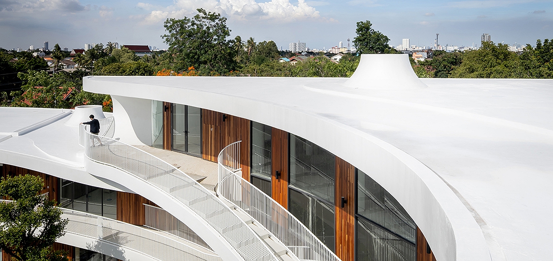 For the outside of ribbon, the continuous shape is link from ground to the top making playing path for kids running to the step roof garden. With the multi big step, the space is defied to be each play space for different kind of play at the same time. The intention of playful and juicy space design along with the greenery nature atmosphere around, it both blend and become a place where learning space and playing space are sitting among the nature.